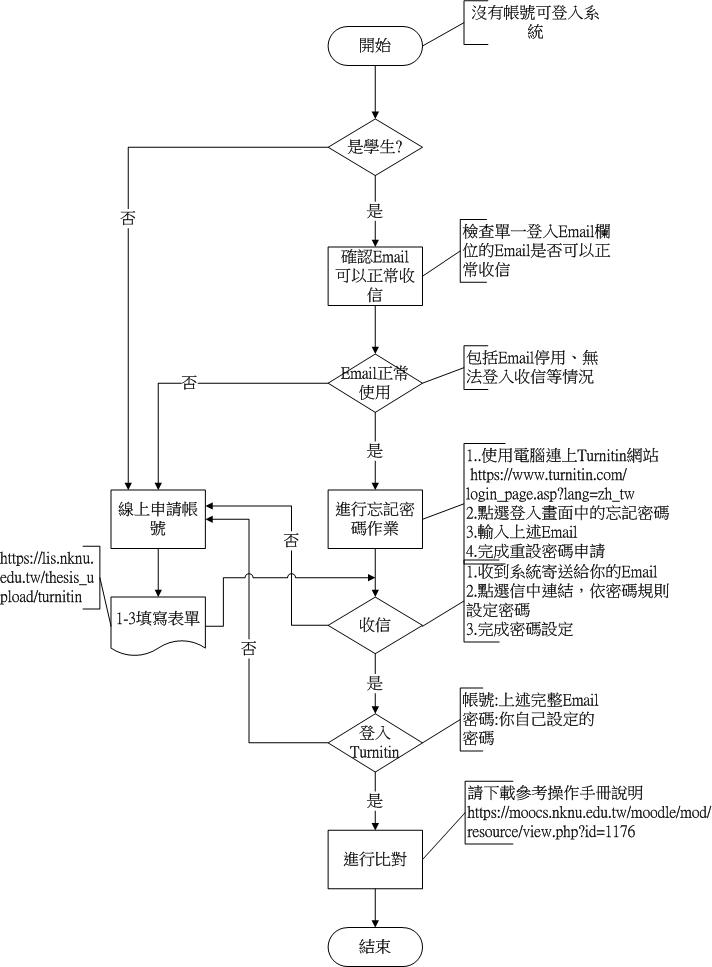(2) 請依系統通知信(24小時內有效)中的連結完成設定使用,若連結已過期(超過24小時未啟用),請參考以下流程圖或[其他帳號問題處理]採忘記密碼方式,讓系統再次發送通知信,完成密碼設定後,即可登入系統進行比對作業。